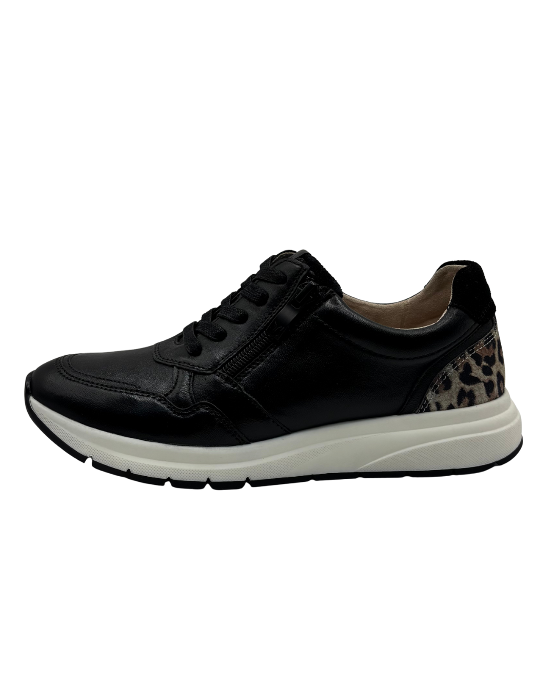 Caprice Black Trainer with Leopard Print Detail