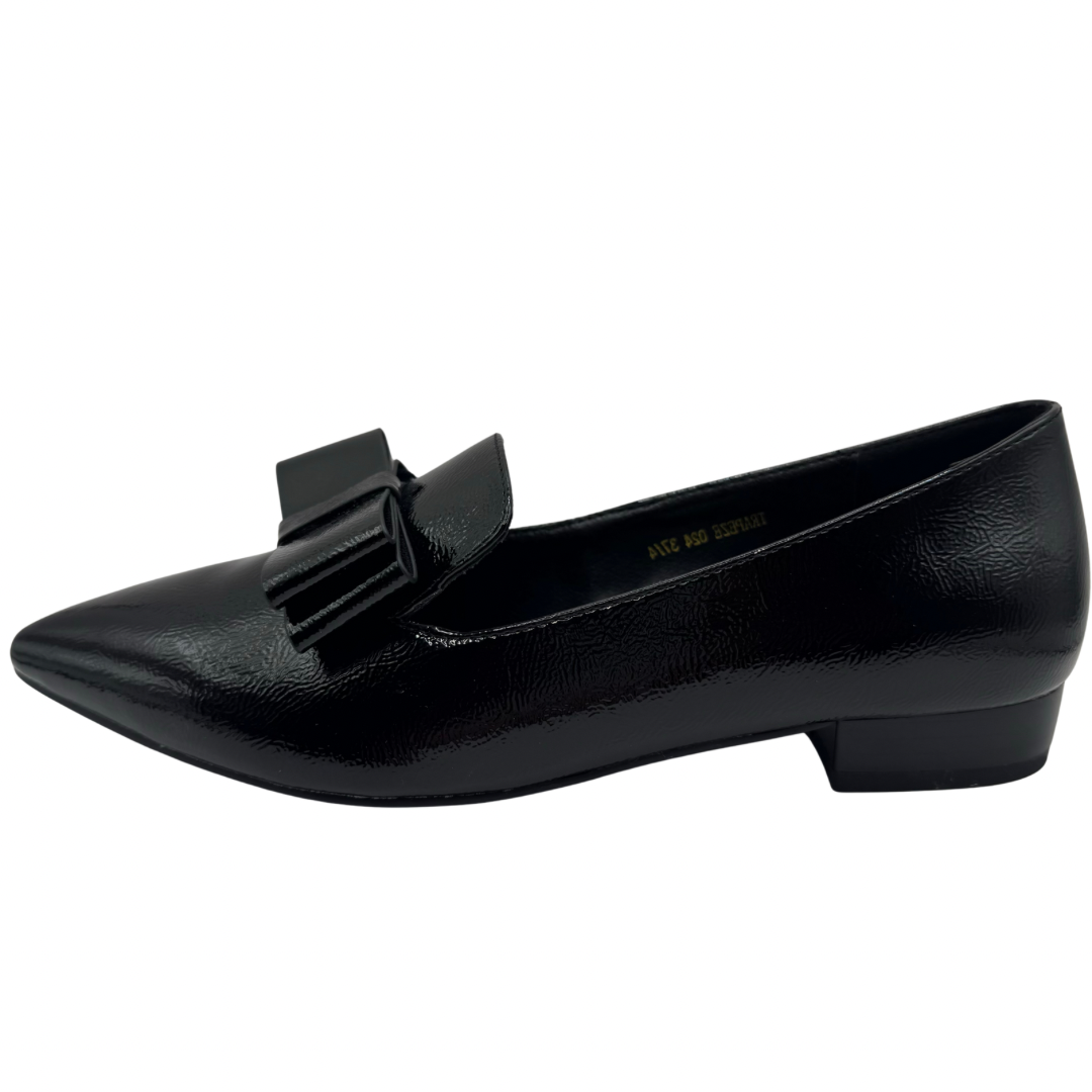 Dancing Matilda Black Patent Pointed Loafers with Bow Detail