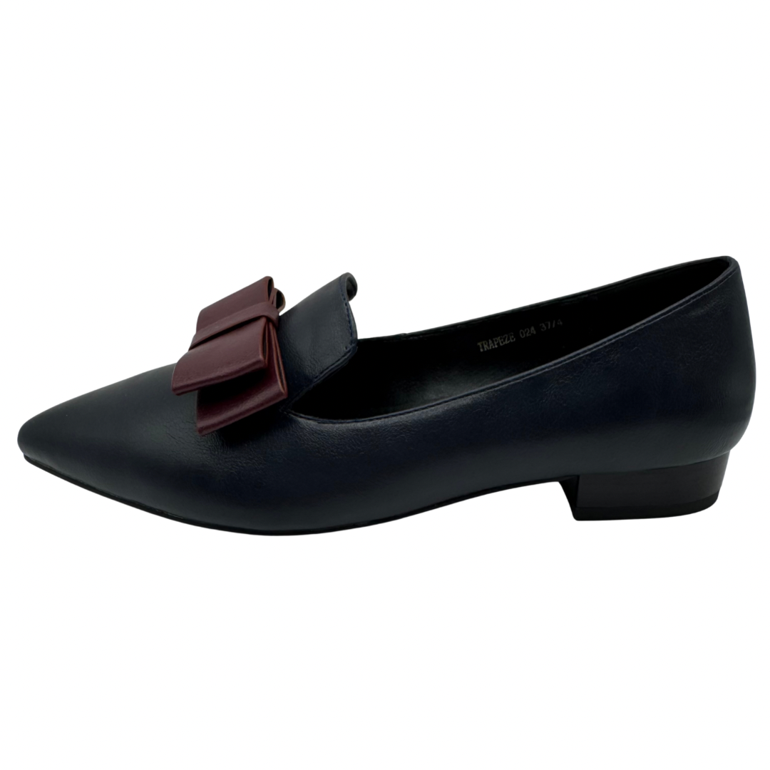 Dancing Matilda Navy Pointed Loafers with Burgundy Bow Detail