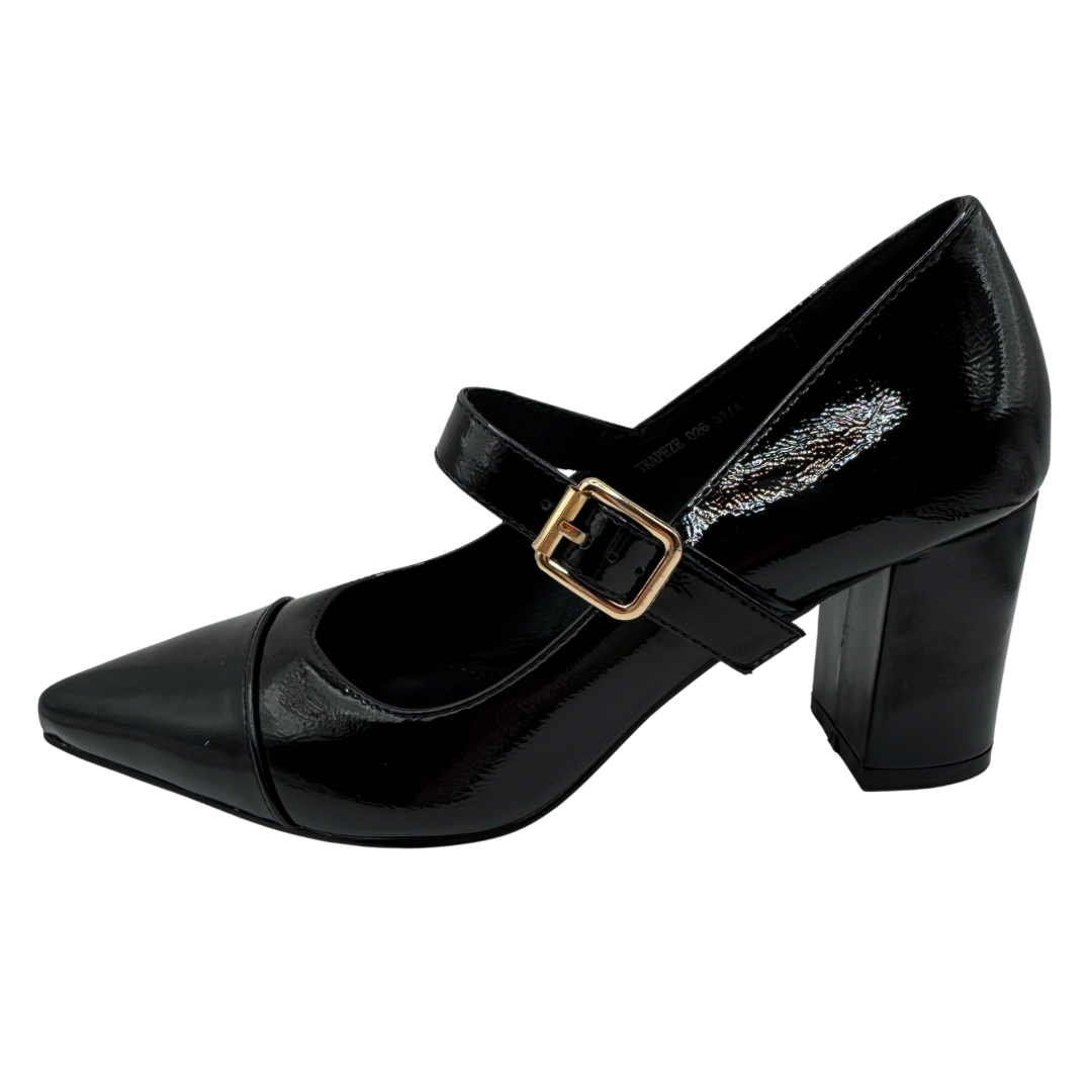 Dancing Matilda Black Patent Pointed Heeled Shoe with Strap
