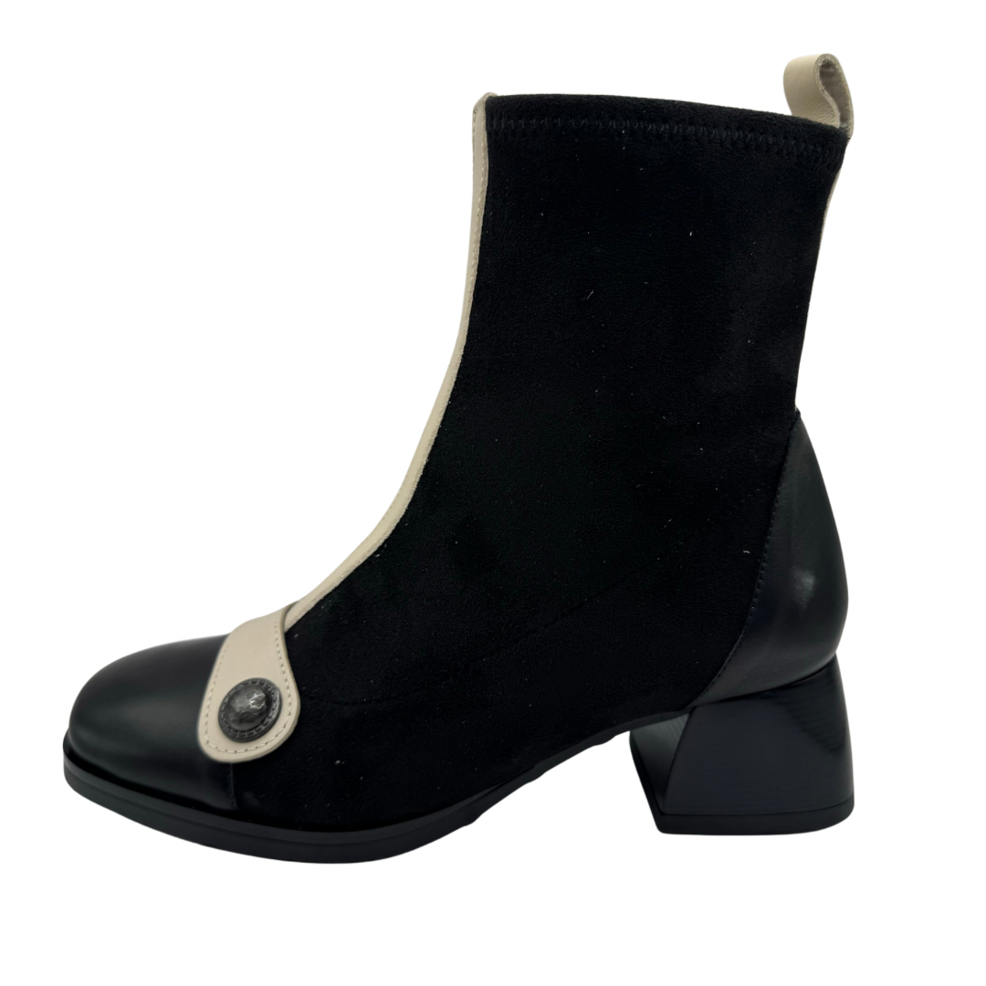Hispanitas Black Heeled Boots with Cream and Button Detail