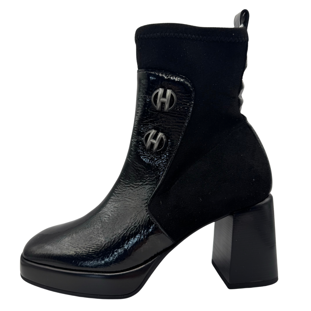 Hispanitas Black Heeled Boots with Patent and Button Detail