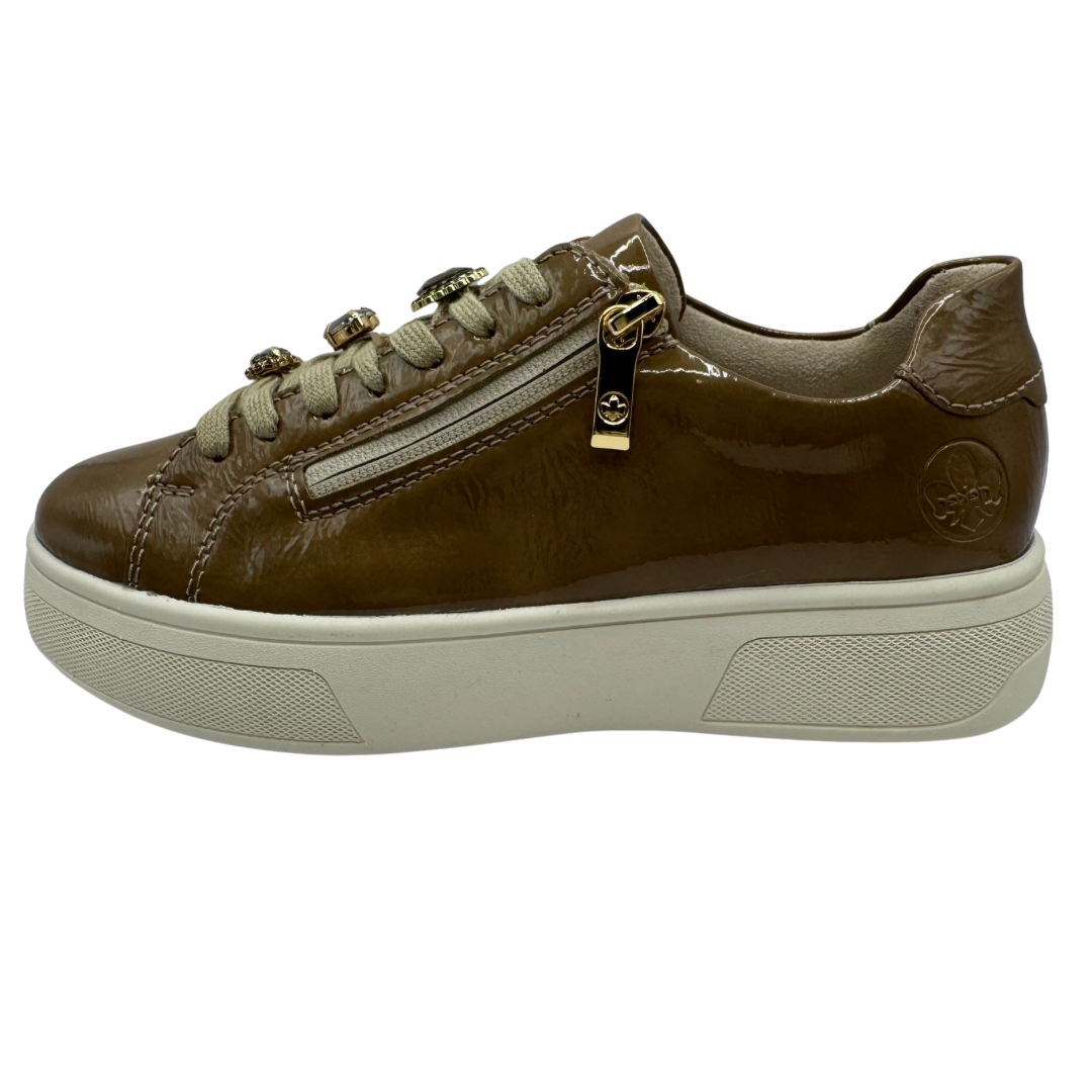 Rieker Beige Patent Trainers with Jewel Detail and Side Zip